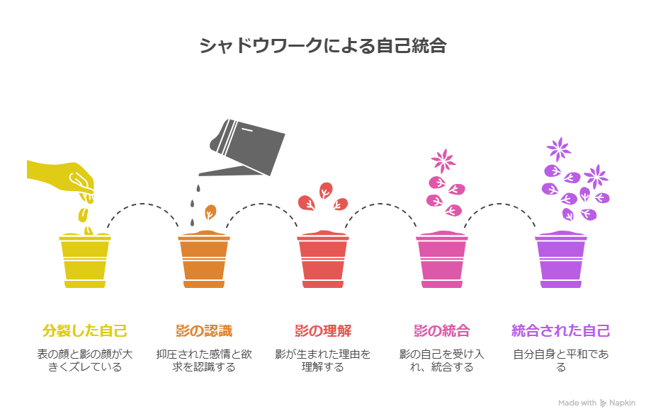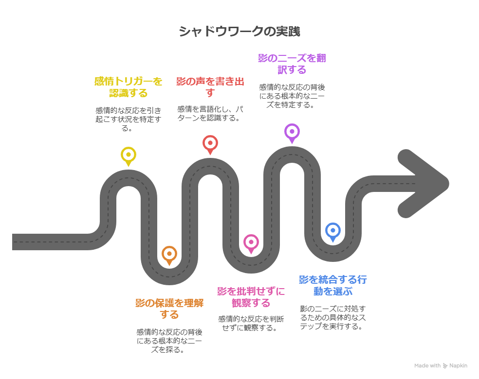 ポジティブ思考で上書きするのではなく、「見たくなかった自分」と向き合い、少しずつ統合していくプロセスだと考えるとイメージしやすいはずです。